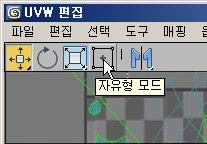 자유형 모드에서 하위 오브젝트 선택은 상자로 둘러싸여 있습니다. 상자의 중심을 드래그하면 선택이 이동하고, 측면의 가운데에 있는 핸들을 드래그하면 선택이 회전하고, 모서리에 있는 핸들을 드래그하면 매핑하는 텍스처에 상대적으로 선택의 배율이 조정됩니다. 커서를 관찰하여 활성 상태인 변환을 확인합니다.