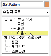 시뮬레이션 내 오브젝트 리스트에서 치마 패턴을 클릭하여 강조 표시한 다음 의상을 선택합니다.