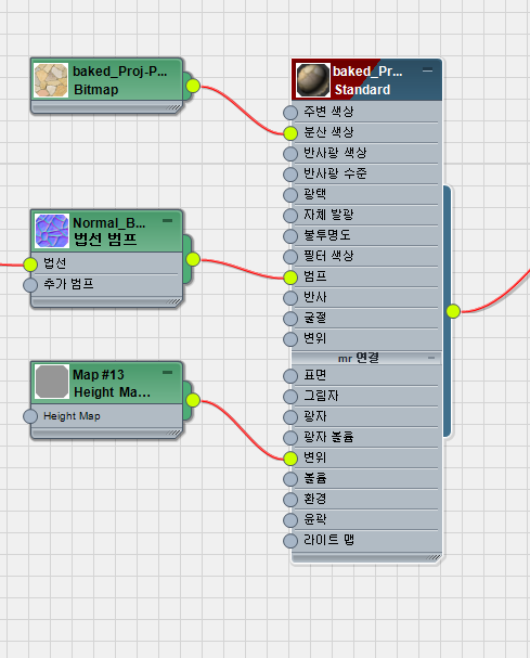 - baked_Proj-Plane_mtl 재질 노드에서 더하기 기호 아이콘(+)을 클릭하여 “mr 연결” 그룹을 연 다음 높이 맵 변위 노드를 적용된 재질의 "mr 연결: 변위" 구성요소에 와이어링합니다.
