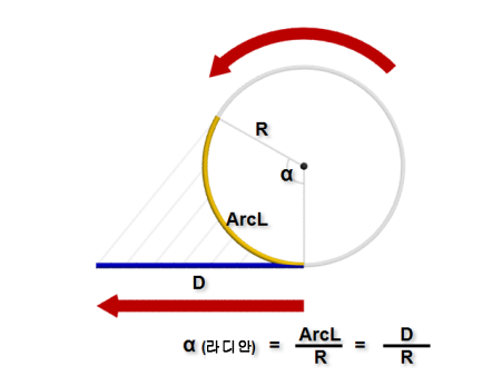 임의의 원형 오브젝트에서 회전량(α)은 원의 반지름과 α 각도에 포함되는 호 길이에 의해 정의됩니다. 라디안으로 표현된 이 회전량(α)은 호 길이를 원의 반지름으로 나눈 값(호 길이/R)과 같습니다. 여기서 각 항목은 다음을 나타냅니다.