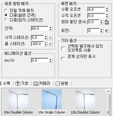 - 세로 방향 배치 그룹에서 단일 오브젝트 배치가 선택되어 있는지 확인한 다음 시작 스테이션 값을 50.0으로 변경합니다. 측면 배치 그룹에서 수평 간격띄우기를 –8.0으로 설정합니다.