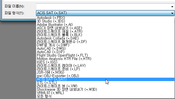 - 내보낼 파일 선택 대화상자의 파일 형식 리스트에서 ACIS SAT(*.SAT)를 선택합니다.