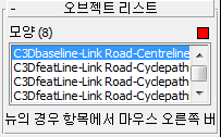 이제 Civil View 탐색기의 아래쪽 패널에 가져온 모양 오브젝트에 대한 오브젝트 리스트 롤아웃이 표시됩니다. C3Dbaseline-Link Road-Centreline 1이 강조 표시됩니다.