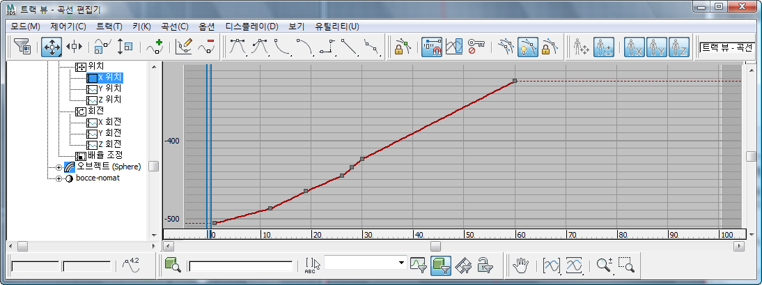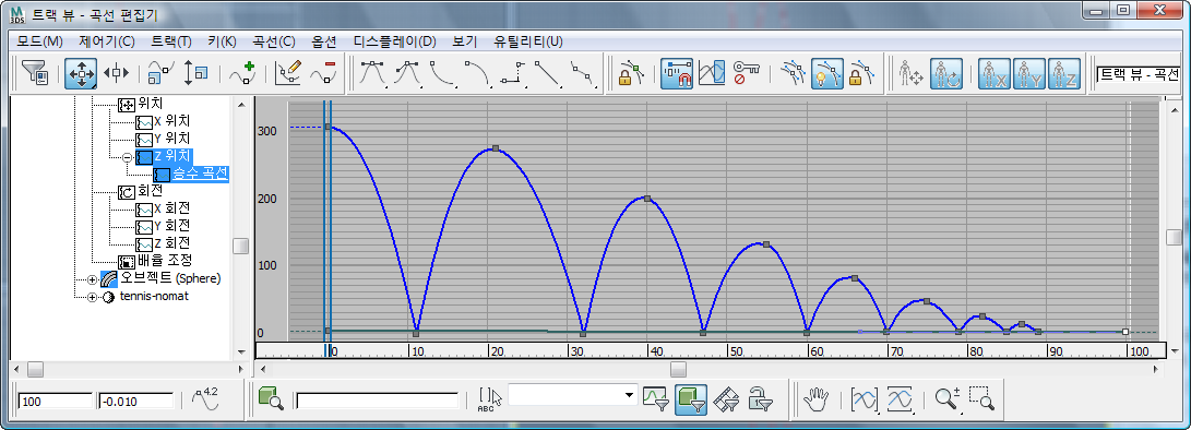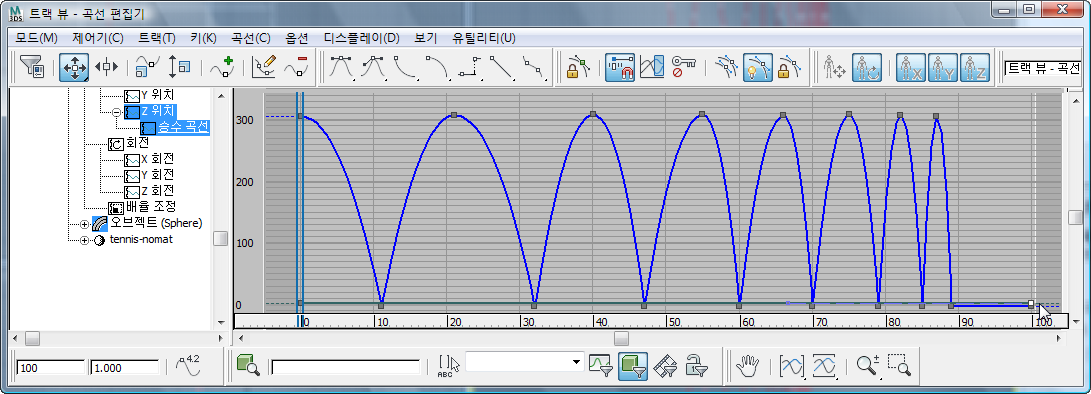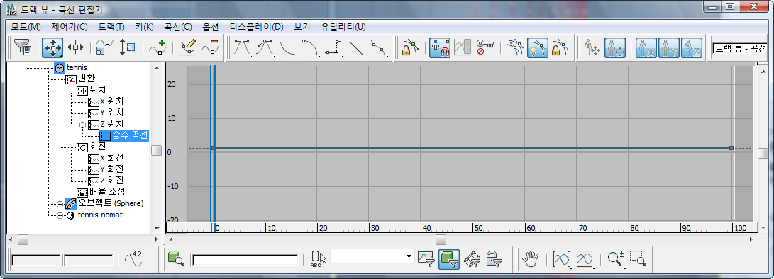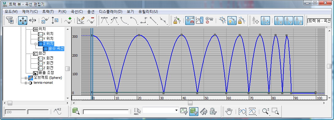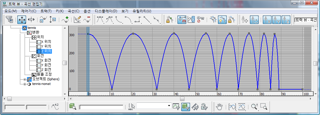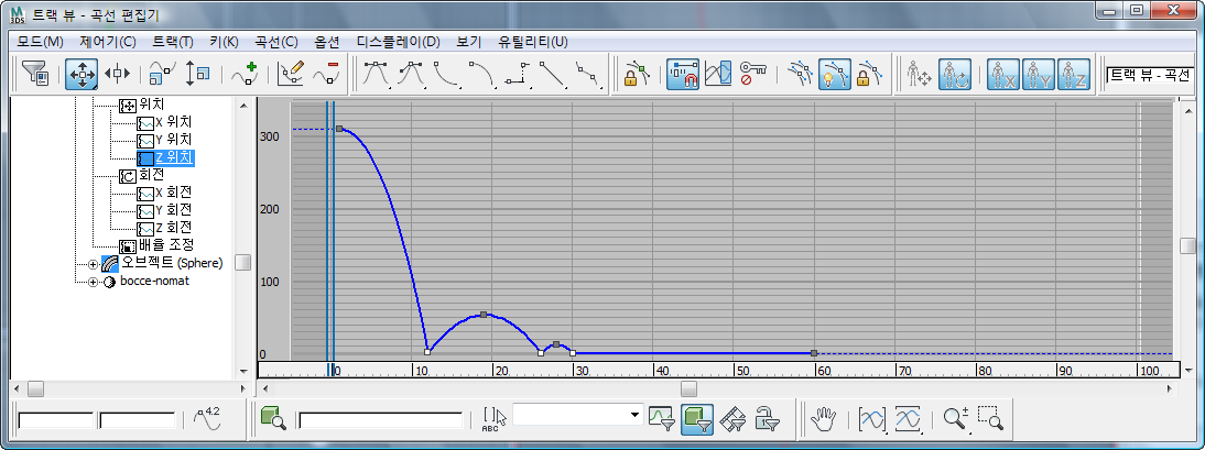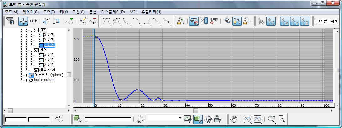 제어기 창에서 Z 위치 트랙을 클릭하면 곡선 창에 해당 곡선이 표시됩니다.