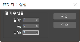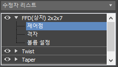 오브젝트 공간 수정자 섹션에서 FFD(상자)를 선택합니다. "FFD"(자유형 변형) 수정자는 선택한 형상을 조정 가능한 격자 상자로 둘러쌉니다.