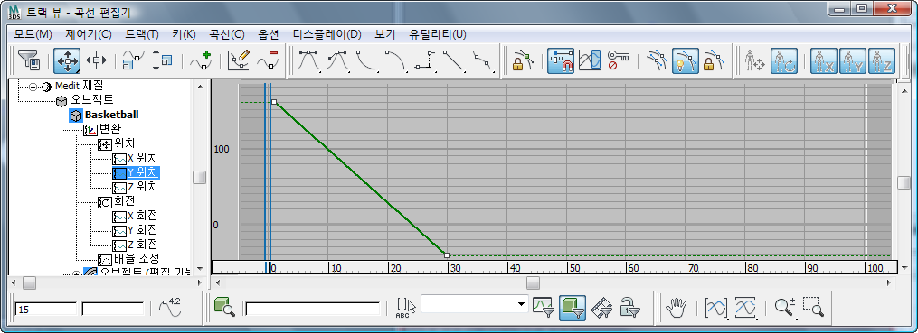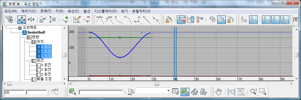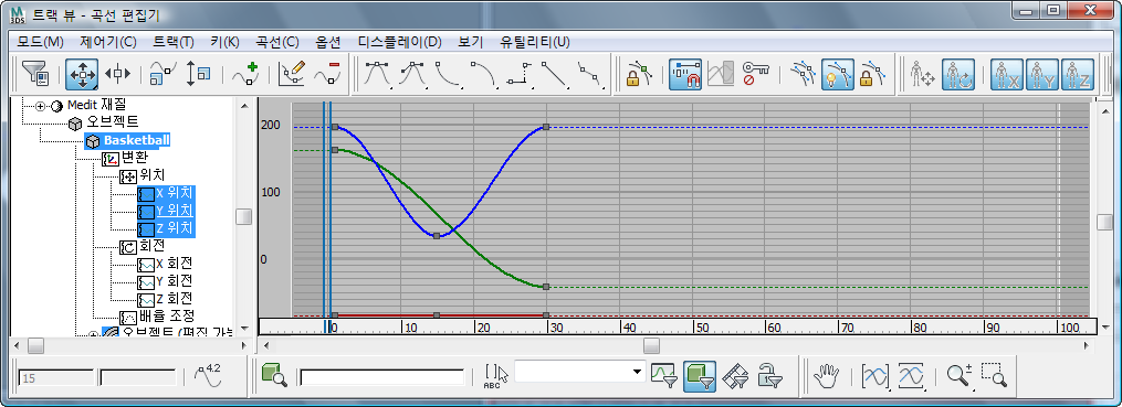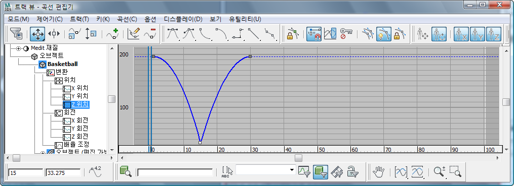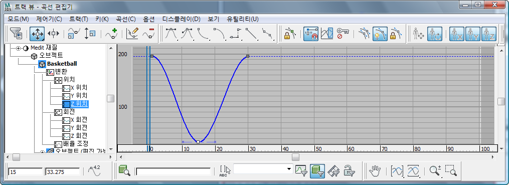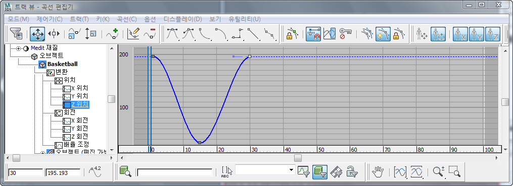 제어기 창(왼쪽의 트랙 및 오브젝트 리스트)에서 Z 위치 트랙을 클릭하여 해당 트랙의 곡선만 표시합니다.