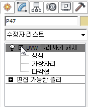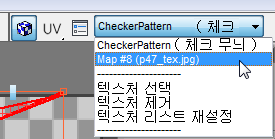 - UVW 편집 대화상자 도구 모음의 오른쪽에 있는 드롭다운 리스트를 열고 맵 #8(p47_tex.jpg) 항목을 선택합니다. 이때 맵 번호는 달라질 수 있습니다.