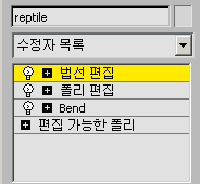 을 사용해 도마뱀 모델을 선택하고 수정자 스택을 확인하면 Mudbox에서 다시 가져오기를 수행하여 법선 편집 수정자와 폴리 편집 수정자의 수정자 두 개가 스택에 추가된 것을 확인할 수 있습니다.