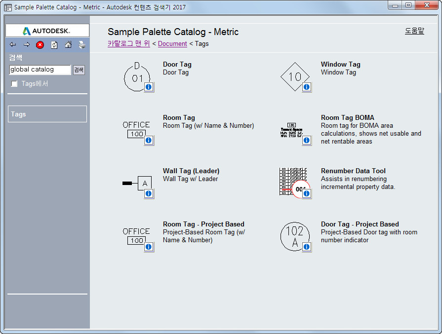 다음 과정에 따라 컨텐츠 검색기의 샘플 팔레트 카탈로그에서 상세 구성요소 삽입 도구 또는 도구 팔레트를 작업영역의 도구 팔레트 세트로 복사하십시오. 팔레트의 대부분은 작업영역에서 사용할 수 있도록 설정된 샘플 도구 팔레트 세트에도 포함되어 있지만, 컨텐츠 검색기의 이 카탈로그는 이미 작업영역 팔레트에 있는 도구를 변경하지 않고 사용자화할 수 있는 백업 도구 저장소 및 도구 소스로 제공됩니다. 일반적으로 도구는 특정 유형 및 크기의 구성요소를 삽입하도록 미리 설정되어 있지만, 일단 작업영역의 팔레트에 놓이면 다른 크기의 구성요소나 다른 범주의 구성요소까지 삽입하도록 도구를 사용자화할 수 있습니다. 동일한 기본 과정을 사용하여 특정 프로젝트에 대해 미리 구성되거나 그룹화된 도구를 보유하기 위해 작성한 카탈로그에서 도구 또는 팔레트를 복사할 수 있습니다.