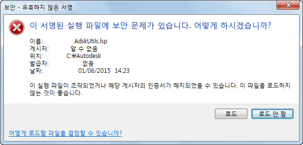 디지털 서명된 사용자 프로그램 파일을 로드할 때 AutoCAD 기반 프로그램은 파일에 부착된 디지털 서명을 확인합니다. 디지털 서명을 확인할 수 있었는지 여부에 대한 메시지 상자가 표시됩니다. 이 메시지를 보고 사용자는 프로그램 파일을 도면 환경에 로드하거나 로드하지 않을 수 있습니다.