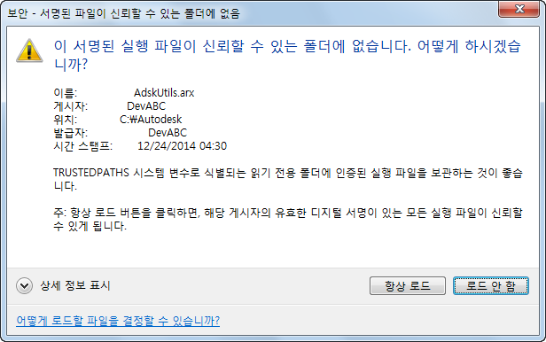 해결 방법: 예상대로 파일을 로드하여 사용합니다. 필요에 따라, 게시자가 서명한 모든 파일에 대해 앞으로 메시지 상자가 표시되지 않도록 게시자를 신뢰할 수도 있습니다.