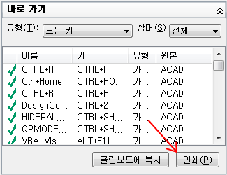 바로 가기 키 또는 임시 재지정 키의 리스트 인쇄