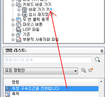 • 바로 가기 키를 작성하려면 명령 리스트 창에서 <파일 이름>의 사용자화 창의 바로 가기 키 노드로 명령을 끌어옵니다.