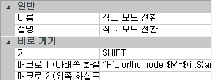 • 매크로 2(키 놓음) 상자에 해당 임시 재지정 키를 놓았을 때 실행될 매크로를 입력합니다. 값이 정의되지 않은 상태에서 키를 놓으면 해당 응용프로그램 및 도면 설정이 임시 재지정이 실행되기 전인 이전 상태로 복원됩니다.