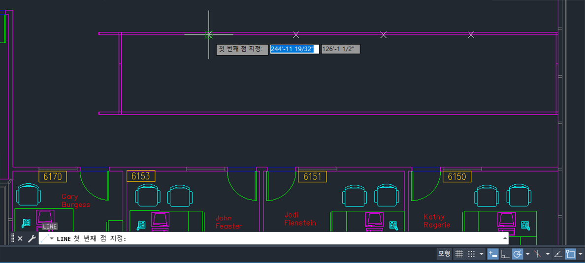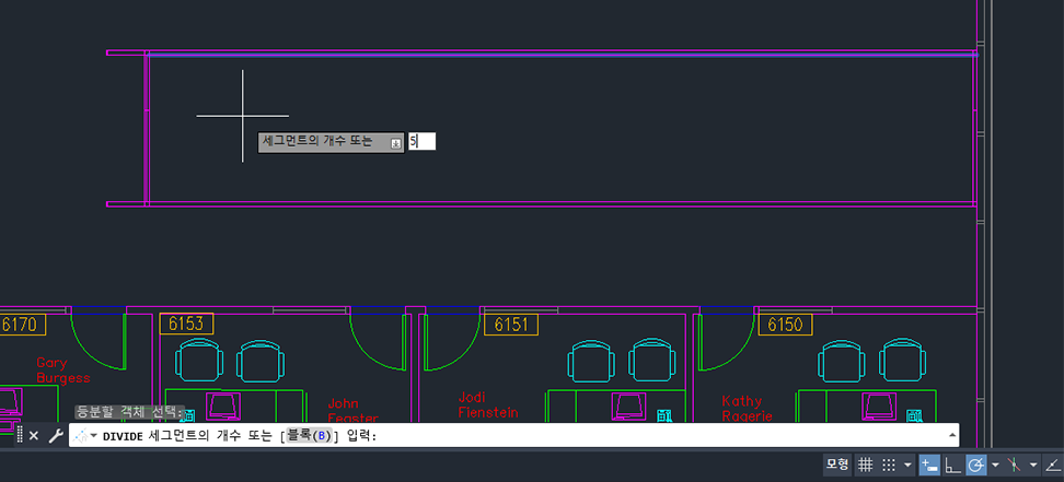벽을 추가하여 이러한 벽 사이의 빈 공간에 5개의 사무실 칸막이를 작성한다고 가정합니다. 이 연습을 직접 다시 작성하려면 Floor Plan Sample.DWG 샘플 도면을 사용하여 칸막이 6156~6162를 삭제하거나, 새 도면을 작성하고 유사한 모양의 직사각형을 간단히 그려서 사무실 벽을 나타낼 수 있습니다.