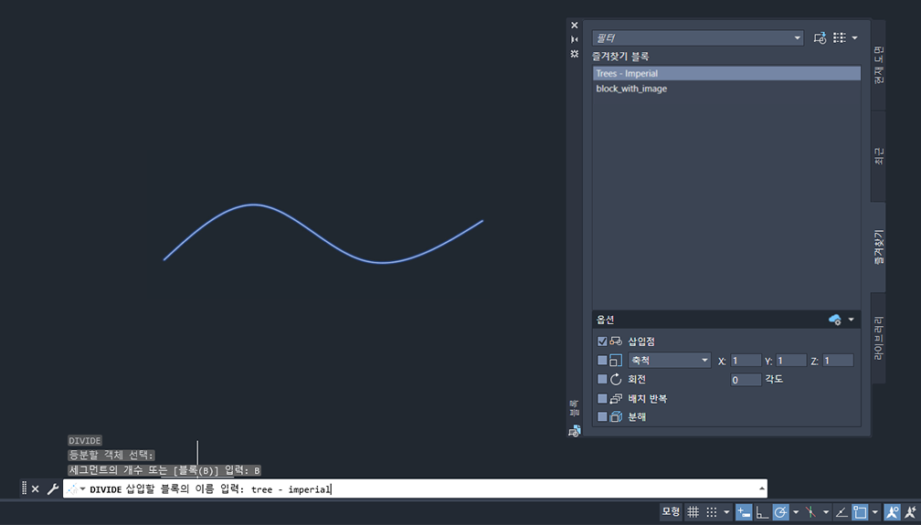 지금까지 DIVIDE 및 MEASURE를 사용하여 객체에 점을 배치했지만 블록 옵션을 사용하여 객체의 길이 또는 둘레를 따라 블록을 배치할 수도 있습니다. 다음 예에서는 DIVIDE를 사용하여 스플라인을 따라 균등한 간격으로 5개의 블록(이 경우 나무)을 배치하겠습니다.