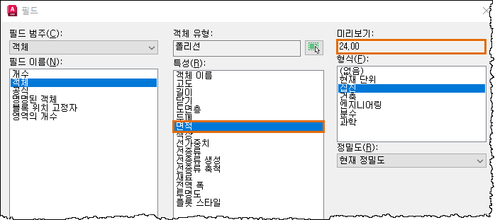 객체의 면적 정보를 찾거나 지정된 점을 사용하는 방법에는 여러 가지가 있습니다. 특성 팔레트를 사용하거나 AREA, MEASUREGEOM 또는 LIST와 같은 명령을 사용할 수 있습니다.