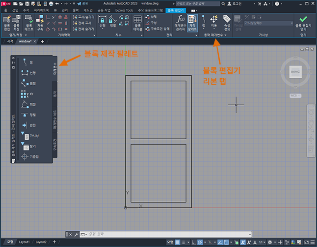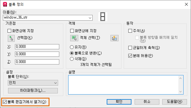 이 문서에서는 36" 폭 x 72" 높이의 크기로 시작하는 윈도우 블록을 작성한 후 다음을 수행합니다.