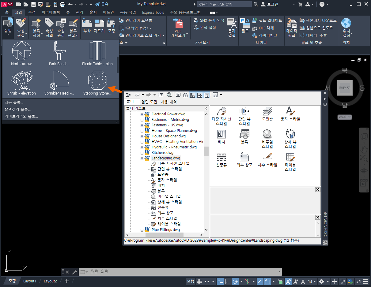 Landscaping.dwg의 도면층, 블록 및 스타일을 템플릿에 추가합니다.