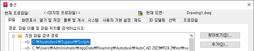 주: 옵션 대화상자(OPTIONS 명령)의 파일 탭에서 AutoCAD 지원 파일 검색 경로 설정의 폴더를 관리할 수 있습니다. AutoCAD 지원 파일 검색 경로 설정에 폴더를 추가하는 데 대한 자세한 내용은 지원 파일 검색 경로를 수정하려면을 참고하십시오.