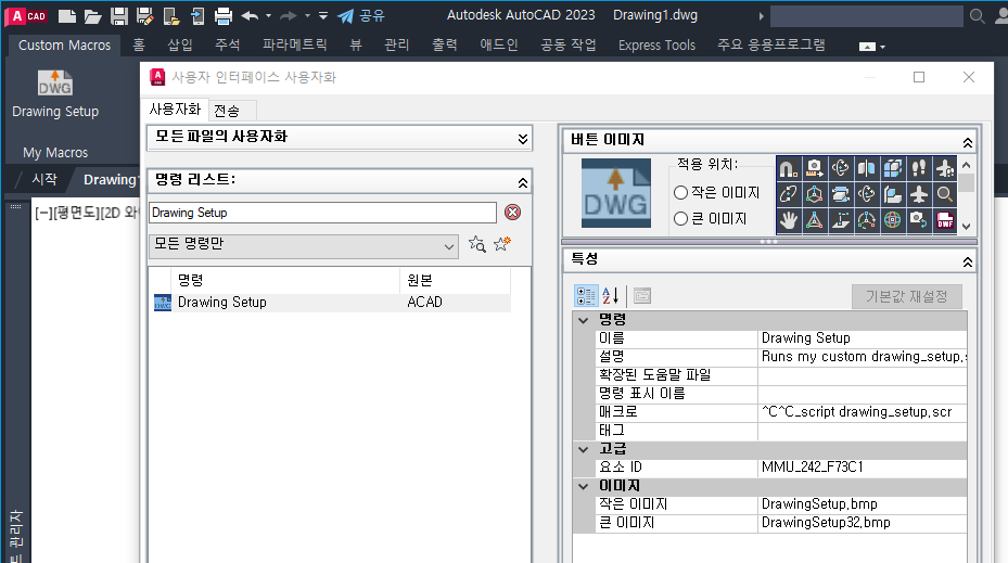 SCRIPT 명령으로 매크로를 정의하여 리본 버튼을 통해 특정 스크립트를 실행할 수 있습니다. SCRIPT 명령을 시작하고 drawing_setup.scr이라는 스크립트 파일을 실행하는 매크로의 모습은 다음과 같을 수 있습니다.