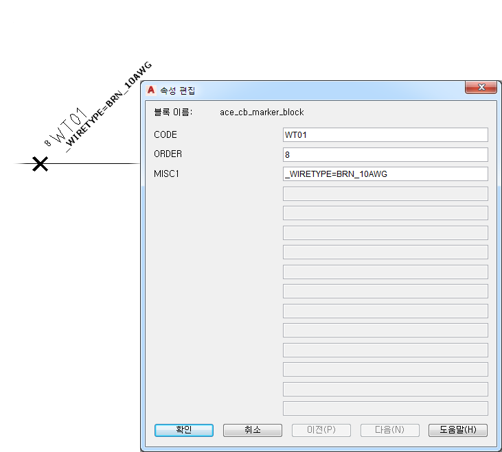 - “_WIRETYPE={도면층 이름}” 형식을 사용하여 해당 MISC1 속성 값을 편집합니다(예: “_WIRETYPE=BRN_10AWG”).