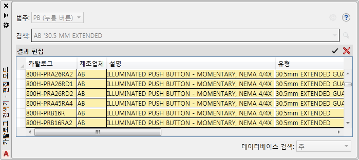 - 어느 부품이 기본 부품인지 나타냅니다. 카탈로그 값을 두 번 클릭할 때 기본 부품이 삽입됩니다.