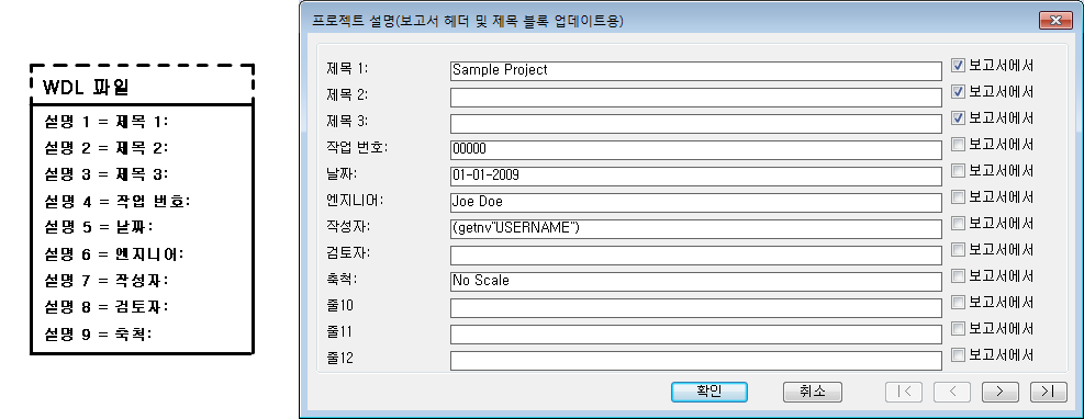 AutoCAD Electrical의 제목 블록 및 프로젝트 설명 대화상자에는 "LINE1", "LINE2" 등과 같은 일반 레이블이 표시됩니다. 제목 블록의 링크와 일치하도록 이러한 레이블을 변경할 수 있습니다. 예를 들어 AutoCAD Electrical 데이터 "LINE10" 값을 제목 블록의 "DRAWN_BY" 속성에 링크한 경우, AutoCAD Electrical에 제목 블록 관련 대화상자가 표시되면 "LINE10"이 아니라 "작성자"가 표시됩니다. 확장자가 WDL인 텍스트 파일에 사용자 레이블이 정의됩니다.