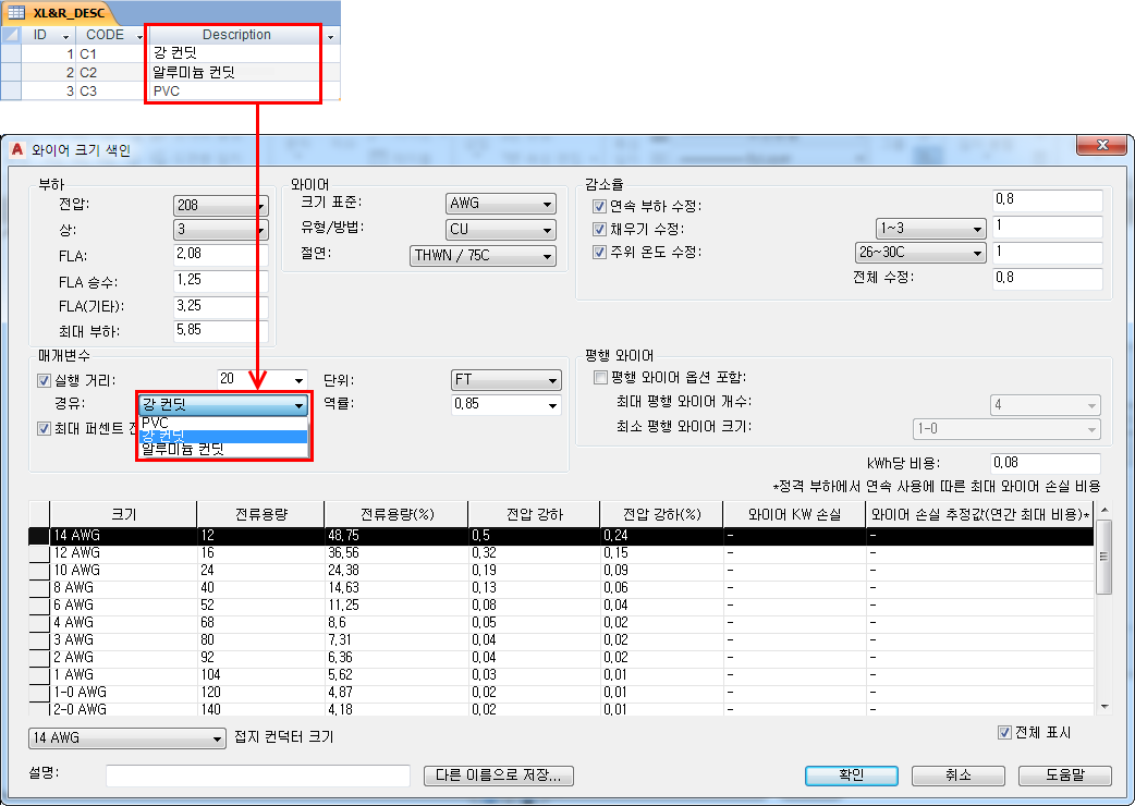 설명 테이블 XL&R_DESC에는 컨딧 또는 레이스웨이 유형 선택 리스트에 대해 와이어 크기 색인 대화상자에서 사용되는 레이블이 포함됩니다. 레이블은 데이터 테이블의 열에도 매핑됩니다.