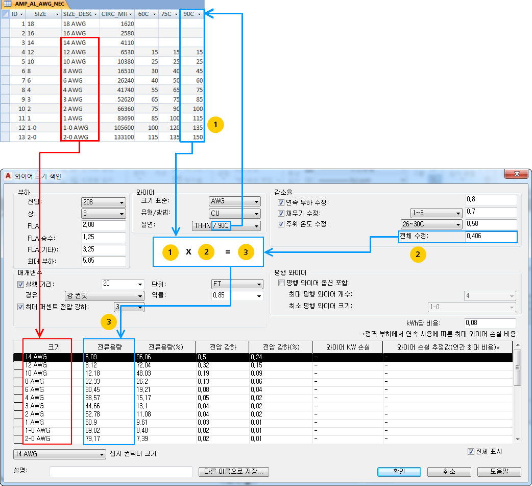 예를 들어, AMP_CU_AWG_NEC라고 명명된 테이블에는 NEC(미국 전기 코드)와 유사한 사항, AWG 크기 및 구리에 대한 와이어 전류용량 정보가 포함되어 있습니다.