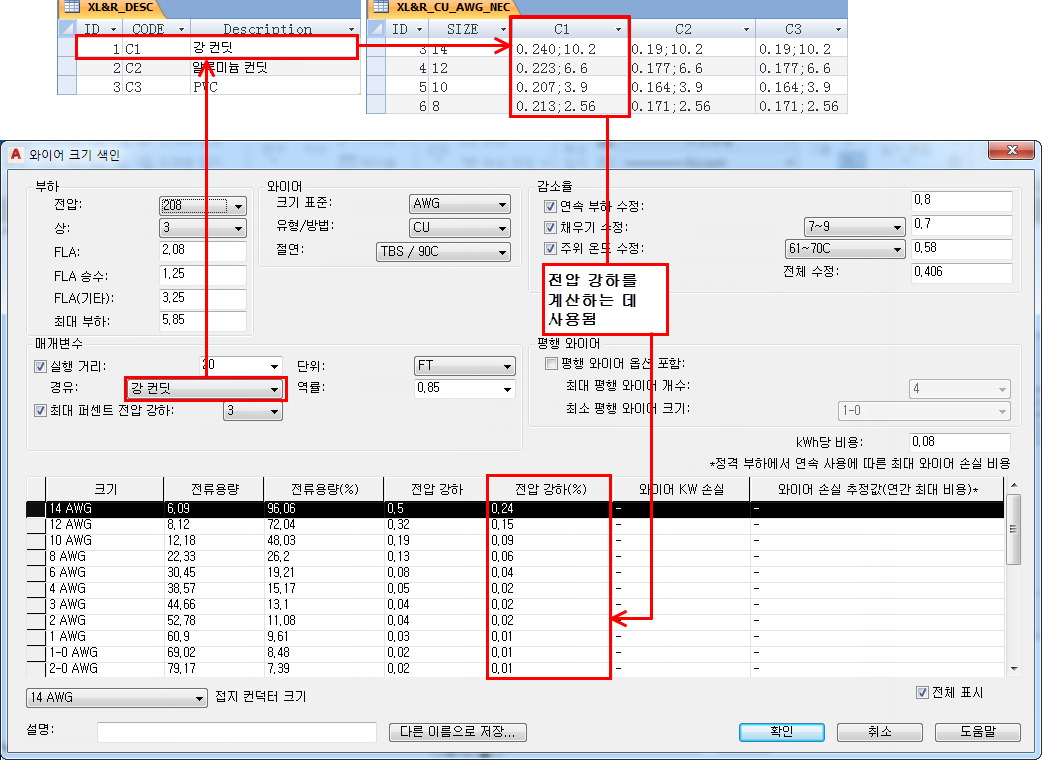 와이어 크기 색인 대화상자에서 전압 선택 리스트의 값 및 기본 공급 전압 값입니다. |