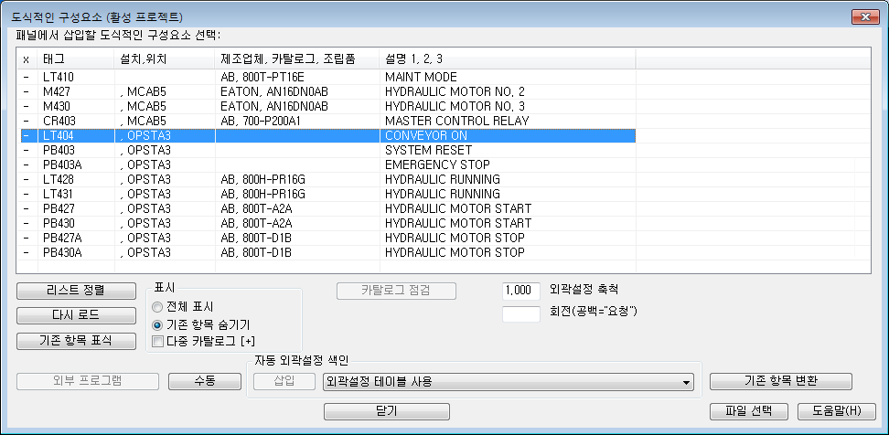 주: 리스트에서 구성요소 옆에 o가 표시되는 경우 구성요소 태그가 일치하는 패널 구성요소를 찾았지만 카탈로그 정보가 일치하지 않음을 표시합니다.