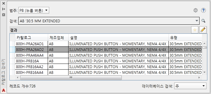 카탈로그 데이터베이스에서 카탈로그 값을 선택하고 연관된 도식적인 구성요소를 삽입합니다.