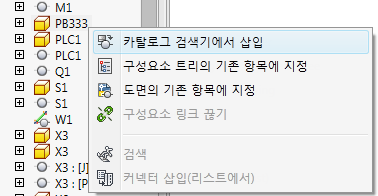 도면의 카탈로그 검색기에서 삽입된 AutoCAD Electrical 구성요소와 구성요소 트리에서 링크가 끊긴 Inventor 부품을 링크합니다.