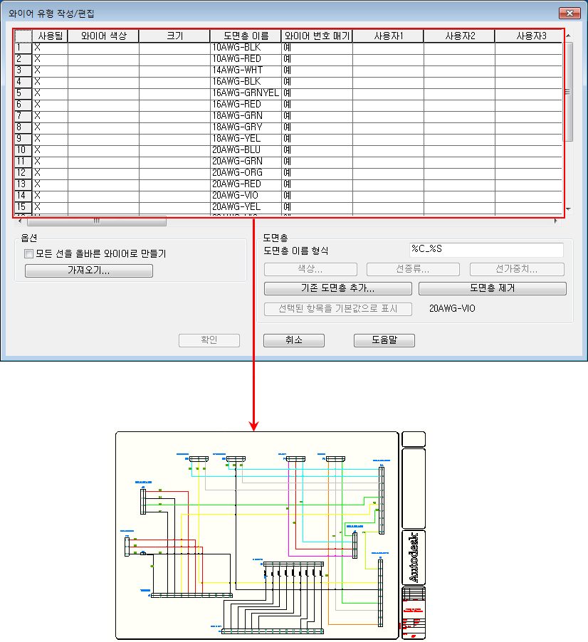 와이어 유형 작성/편집 도구를 사용하여 새 와이어 유형을 작성하거나 기존 와이어 유형을 편집할 수 있으며 와이어 유형 변경/변환 도구를 사용하여 선을 와이어로 변환할 수 있습니다. 와이어 도면층 이름 및 연관된 와이어 특성(예: 와이어 색상, 크기 및 와이어 도면층에 와이어 번호 매기기를 설정할지 여부)이 도면 파일에 저장됩니다. 새 와이어의 와이어 도면층은 다음 규칙에 따라 결정됩니다.