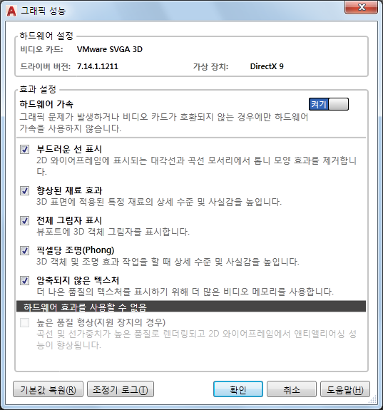 - 하드웨어 가속을 사용하여 현재 드라이버에서 사용할 수 있는 모든 효과 설정을 조정할 수 있습니다. 꺼져 있는 경우 부드러운 선 표시 옵션만 사용하도록 설정됩니다.