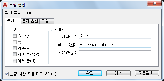 블록을 삽입할 때 속성에 지정된 기본값을 설정합니다.