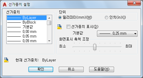 도면층에 대한 DEFAULT 선가중치를 조정합니다. (LWDEFAULT 시스템 변수)