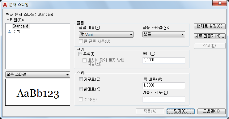 도면에 있는 현재 스타일 및 현재 스타일의 문자에 대화상자에서 지정한 스타일 변경 사항을 적용합니다.