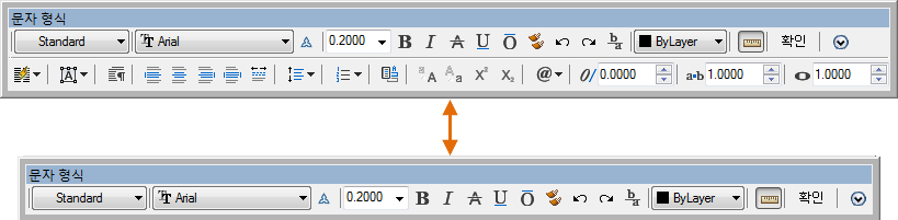 문자 형식 도구막대의 표시를 조정합니다. 이 옵션은 MTEXTTOOLBAR 시스템 변수를 설정합니다. (단일 행 문자에 대해서는 사용할 수 없습니다.)