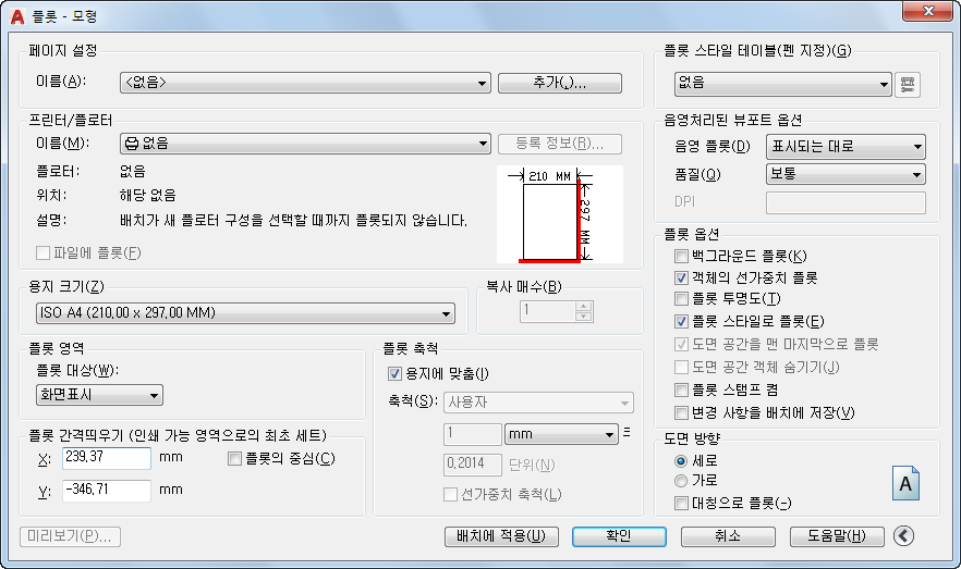 도면에서 플롯할 부분을 지정합니다. 플롯 대상에서 플롯될 도면의 영역을 선택할 수 있습니다.
