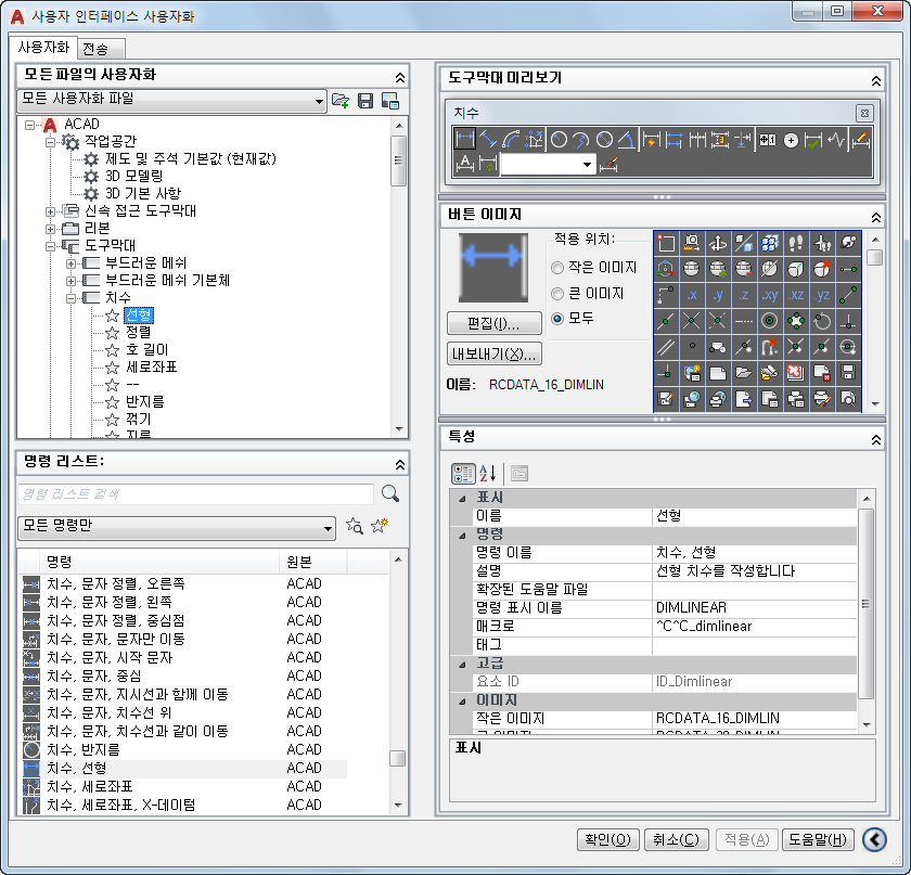 작업공간, 도구막대, 메뉴, 리본 패널, 바로 가기 메뉴 및 기타 사용자 인터페이스 요소를 사용자화하는 데 필요한 인터페이스를 제공합니다.