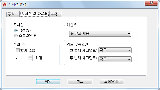 지시선 주석 유형을 설정합니다. 선택한 유형에 따라 QLEADER 지시선 주석 프롬프트가 변경됩니다.