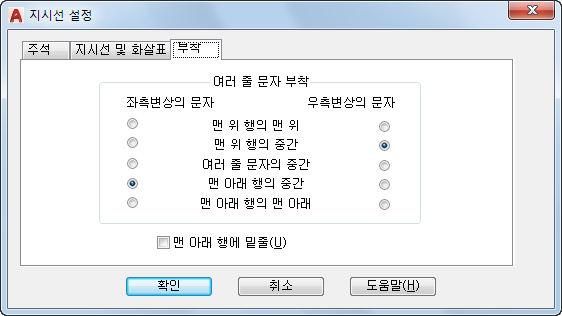 지시선과 여러 줄 문자 주석의 부착 위치를 설정합니다. 주석 탭에서 여러 줄 문자를 선택한 경우에만 이 탭을 사용할 수 있습니다.