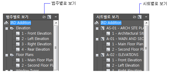 시트 리스트 탭에서 시트를 하위 세트라는 집합으로 정렬할 수 있습니다. 시트 뷰 탭에서 뷰를 범주라는 집합으로 정렬할 수 있습니다.