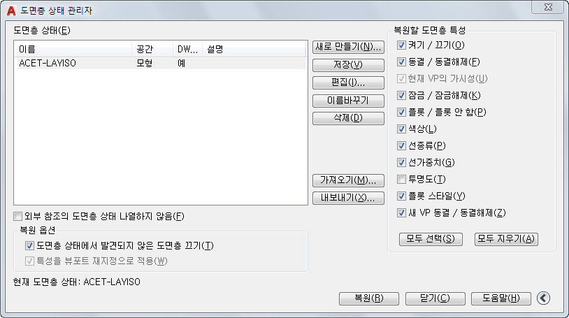 도면층 상태 편집 대화상자를 표시합니다. 여기서 선택한 도면층 상태를 수정할 수 있으며 수정 후 자동으로 저장됩니다.