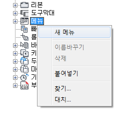 1. 사용자화 탭에 있는 <파일 이름>의 사용자화 창에서 메뉴 노드를 마우스 오른쪽 버튼으로 클릭합니다. 새 메뉴를 클릭합니다.
