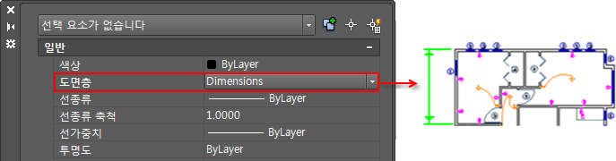 객체의 일부 특성은 도면층별로(ByLayer) 설정하거나 도면층에 관계없이 특성을 명시적으로 지정하여 설정할 수 있습니다.