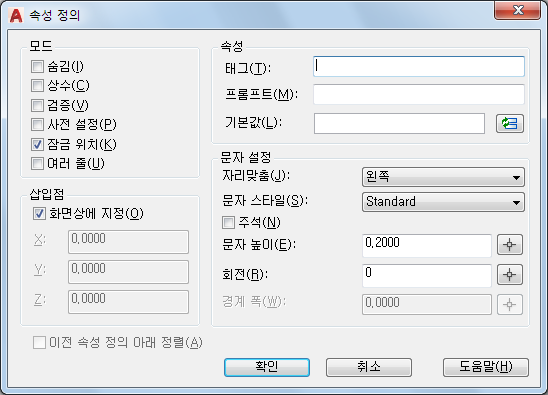 기본값은 AFLAGS 시스템 변수에 저장되어 있습니다. AFLAGS 설정을 변경하면 새 속성 정의에 대한 기본 모드에 영향을 주지만 기존 속성 정의에는 아무런 영향이 없습니다.