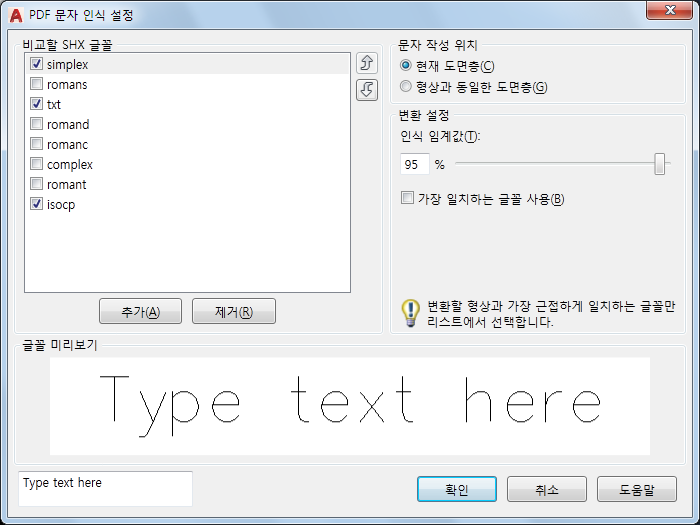 PDF 파일에서 가져온 SHX 형상을 개별 여러 줄 문자 객체로 변환하기 위한 옵션을 설정합니다.